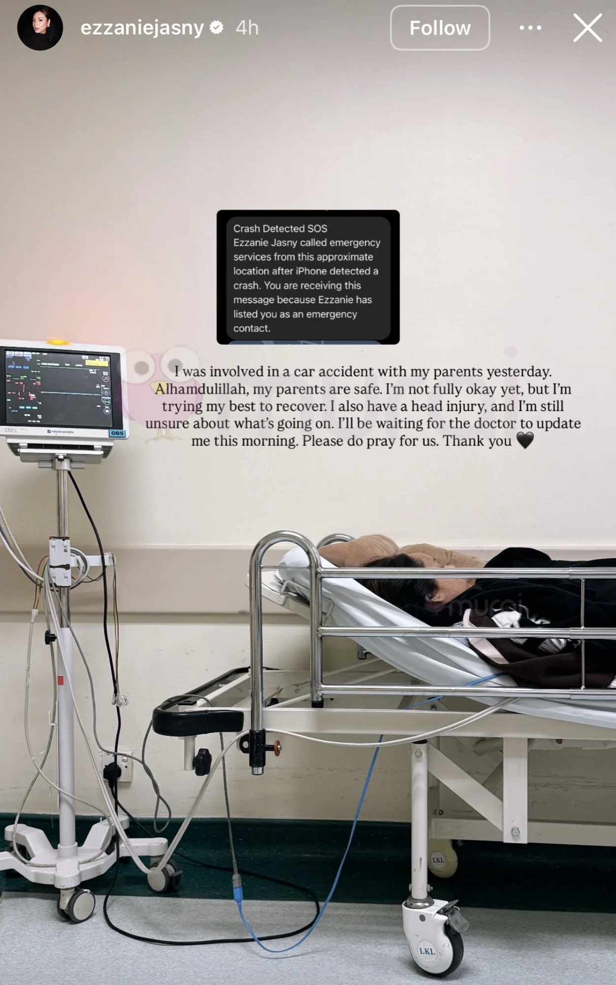 “Saya terlibat dalam kemalangan kereta dengan ibu bapa saya semalam. Alhamdulillah, ibu bapa saya selamat. Saya belum sepenuhnya baik, tapi saya cuba yang terbaik untuk sembuh.”-kongsi Ezzanie di Insta Stories