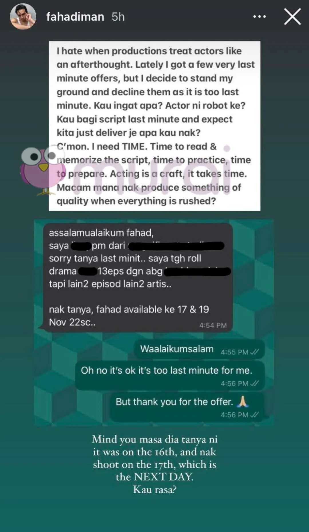 Menerusi Insta Stories, Fahad akui terpaksa menolak tawaran produksi tersebut kerana tidak mempunyai masa yang cukup untuk membuat persiapan.