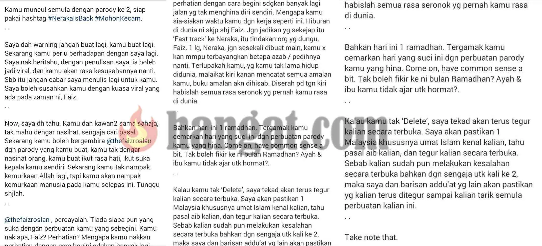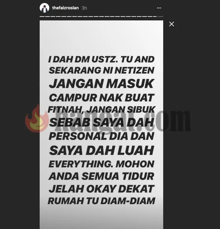 Tambah pendakwah ini juga, dia sama sekali tidak akan teragak-agak untuk menegur Faiz secara terbuka sekiranya tidak masih berkeras untuk memuatnaik video tersebut di Instagram nya. Hasil tinjauan kami pada akaun Instagram milik Faiz, video dan gambar-gambar tersebut masih lagi ada namun kapsyen telah pun ditukar.