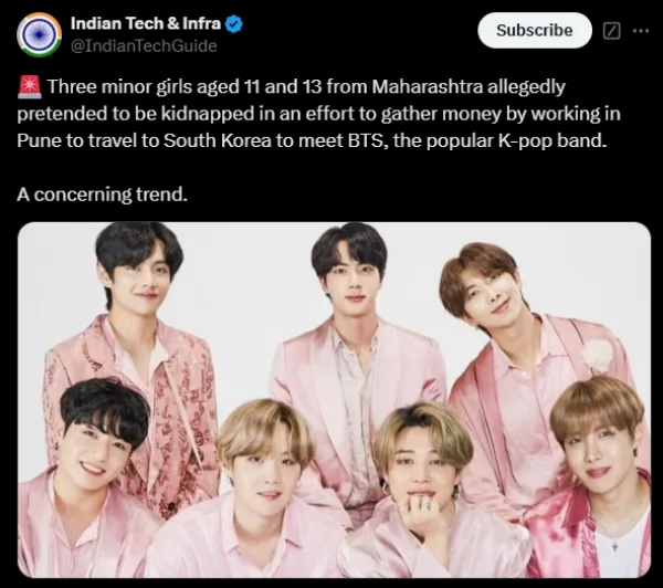 Tiga gadis remaja yang berusia antara 11 tahun dan 13 tahun dari daerah Dharashiv di Maharashtra, India, baru-baru ini telah melakukan tindakan yang melampau dalam percubaaan untuk bertemu BTS.