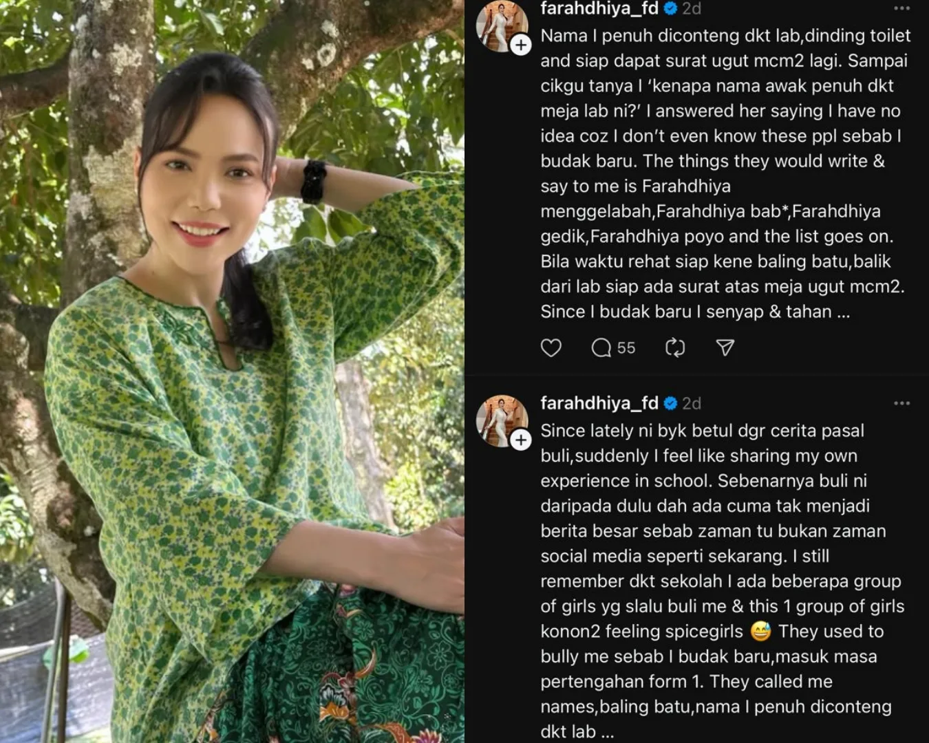 Berkongsi kisahnya dibuli ketika sekolah, pelakon dan penyanyi Farahdhiya mengatakan insiden tersebut berlaku ketika dia berusia 13 tahun. Berbeza dengan zaman sekarang, Farahdhiya mendedahkan bahawa kes buli pada ketika itu tidak tular kerana ketiadaan media sosial.