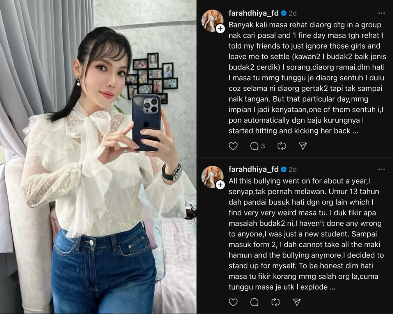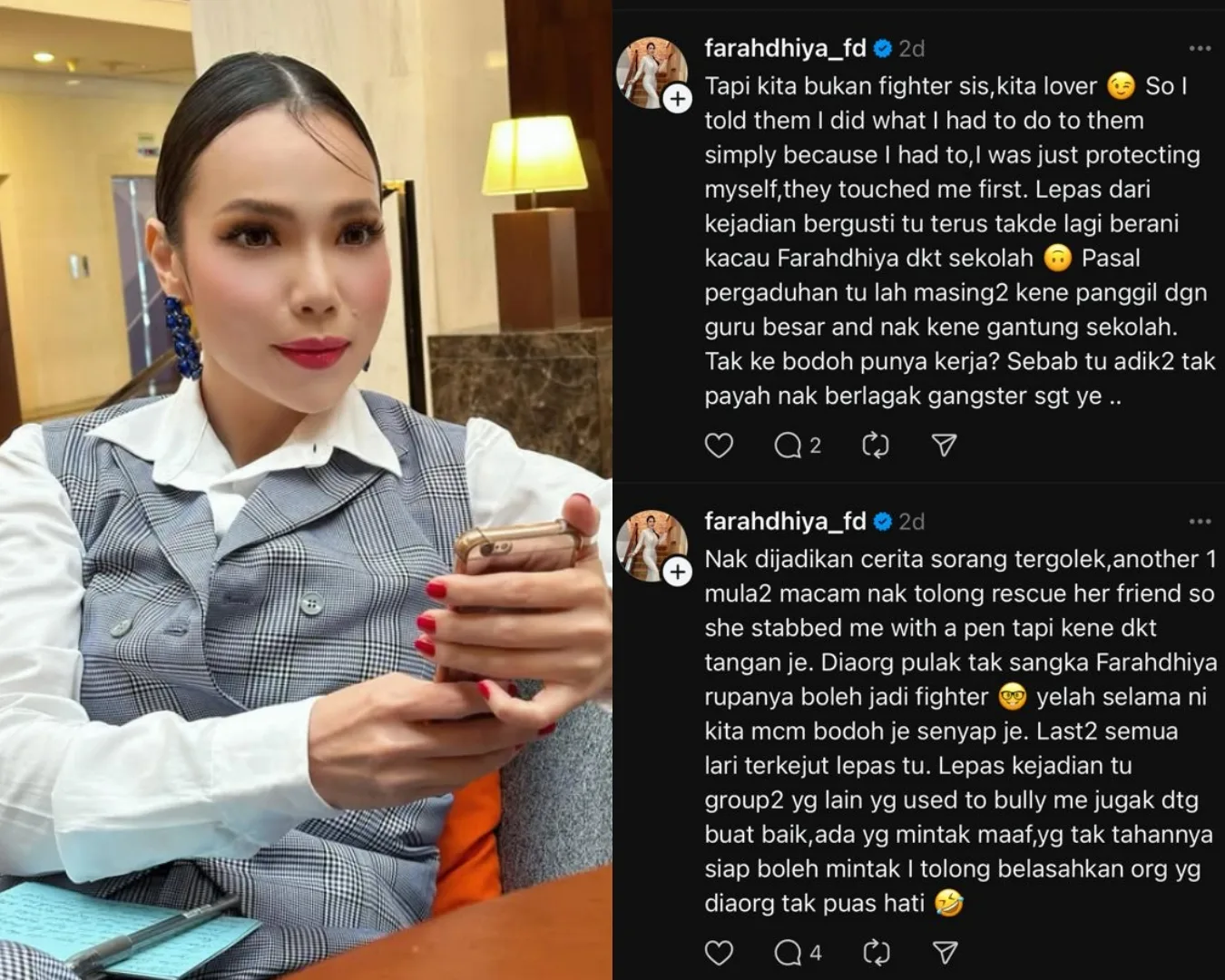 “I pun automatically dengan baju kurungnya, I started hitting and kicking her back. Nak dijadikan cerita seorang tergolek, another 1 mula-mula macam nak tolong rescue her friend so she stabbed me with a pen tapi kena dekat tangan je. Diorang pulak tak sangka Farahdhiya rupanya boleh jadi fighter.”