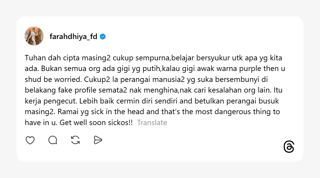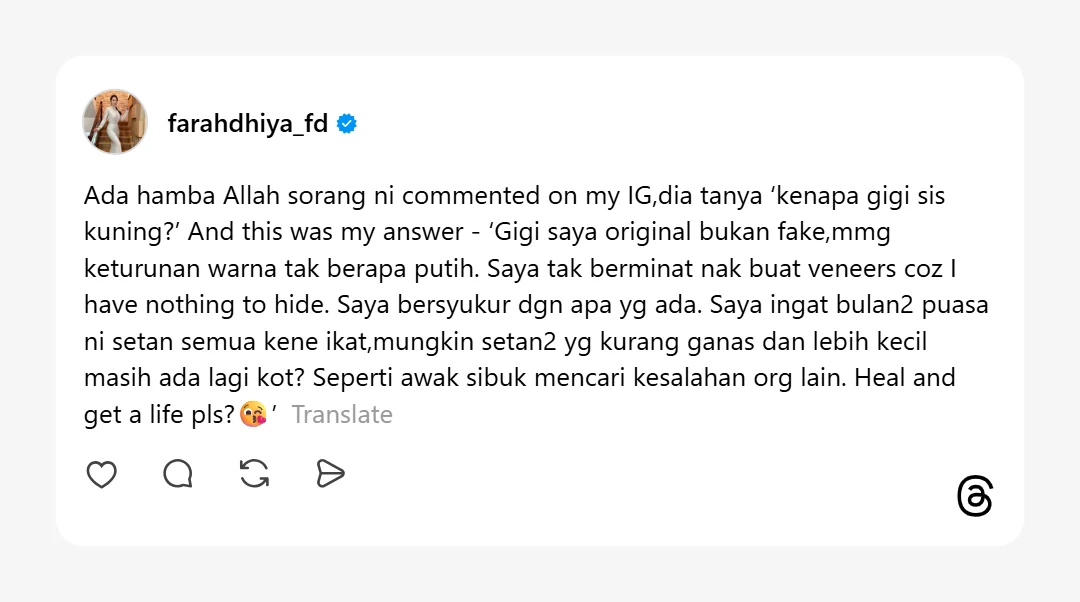 Saya tak berminat nak buat veneers sebab saya tiada apa yang mahu disembunyikan. Saya bersyukur dengan apa yang ada. Saya ingat bulan-bulan puasa ni setan semua kena ikat, mungkin setan-setan yang kurang ganas dan lebih kecil masih ada lagi ke? Seperti awak sibuk mencari kesalahan orang lain. Heal and get a life please?.”-tulis Farahdhiya di Thread