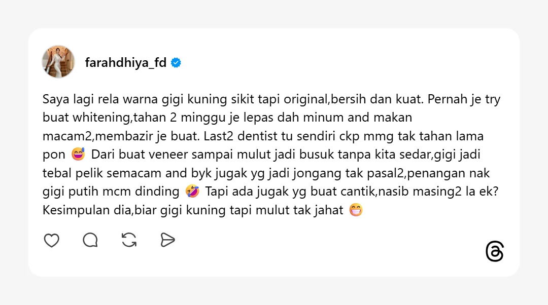 “Saya lagi rela warna gigi kuning sikit tapi origina, bersih dan kuat. Pernah je try buat whitening, tahan 2 minggu je lepas dah minum dan makan macam-macam, membazir je buat.