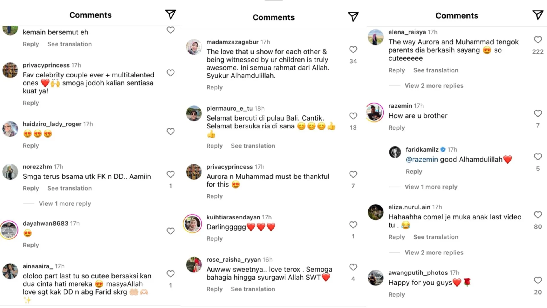 Perkongsian Farid dibanjiri dengan komen netizen yang meluahkan rasa terharu melihat kebahagiaan keluarga bahagia ini biarpun pernah berdepan dengan kemelut rumah tangga pada tahun lalu.