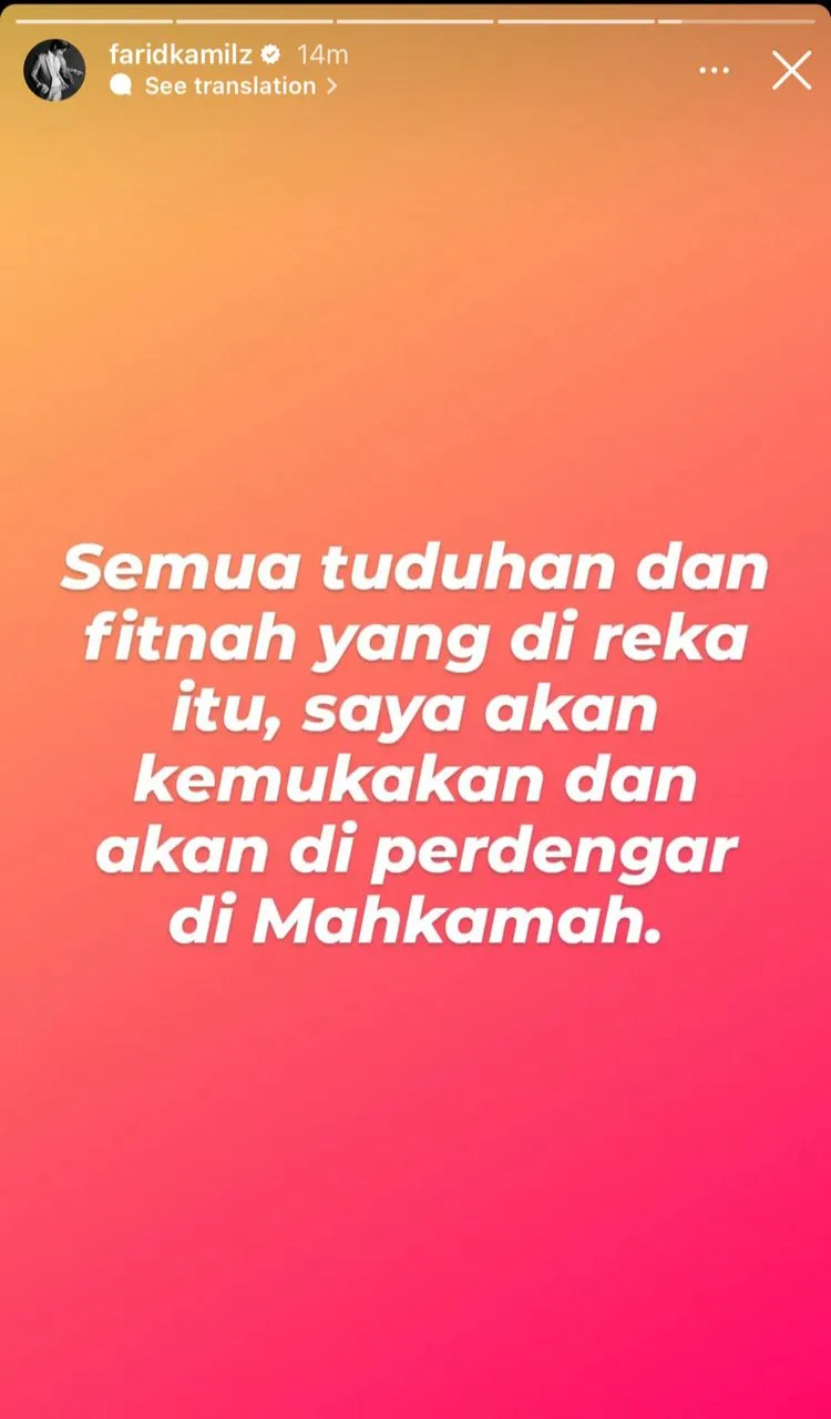 Farid bagaimanapun memilih untuk mengemukakan ulasan berkenaan di Mahkamah kelak, dengan memuat naik beberapa kenyataan di Instagram story miliknya.
