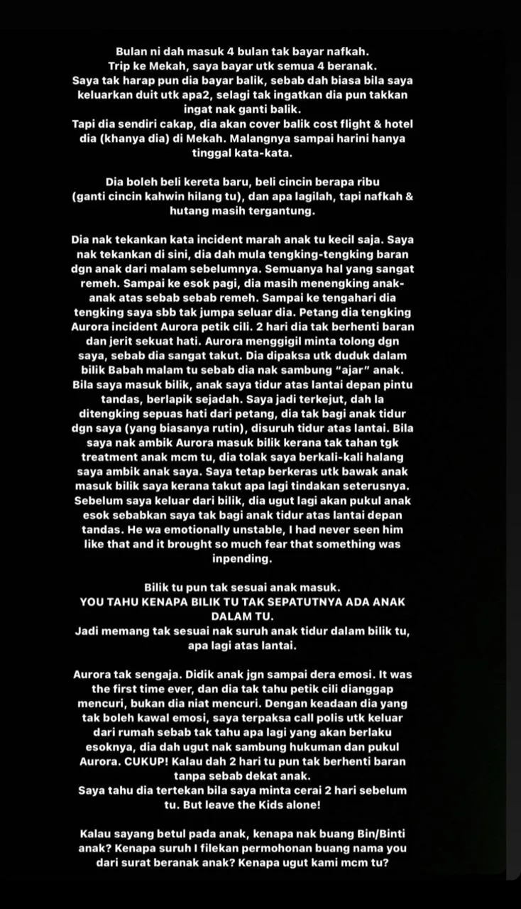“Bila saya mahu ambil Aurora masuk bilik kerana tak tahan tengok layanan anak macam itu, dia tolak saya berkali-kali halang ambil anak. Saya tetap berkeras bawa anak masuk bilik saya kerana takut apa lagi tindakan seterusnya.