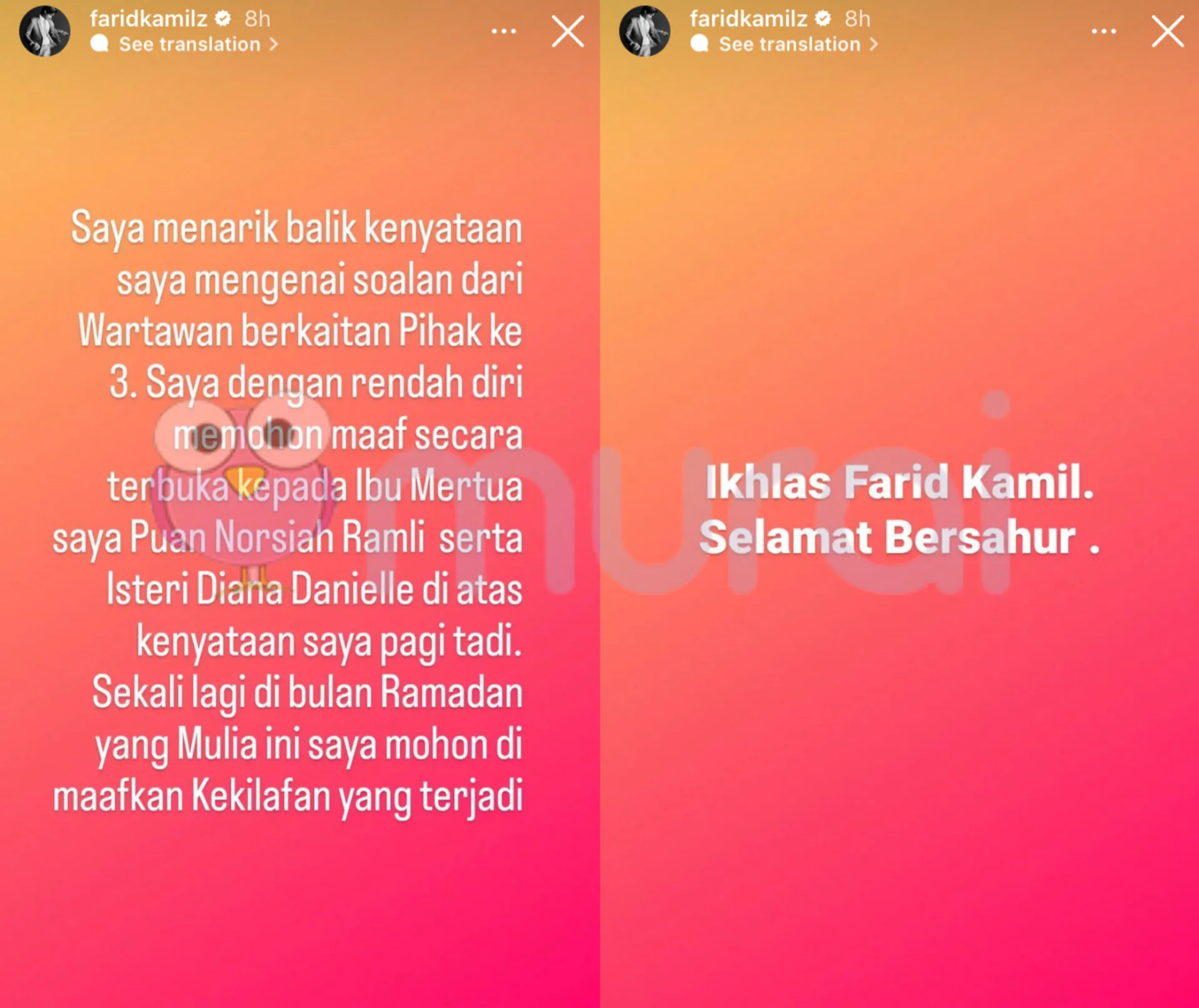 “Saya menarik balik kenyataan saya mengenai soalan dari wartawan berkaitan pihak ke-3.”-tulis Farid Kamil di Instagram