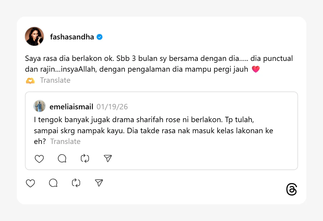 Tidak berdiam diri, Fasha Sandha menerusi hantaran di Threads tampil mempertahankan Sharifah Rose dengan menyifatkan lakonannya itu baik selain menepati masa dan rajin sepanjang mereka bekerjsama dalam salah sebuah drama bersiri.