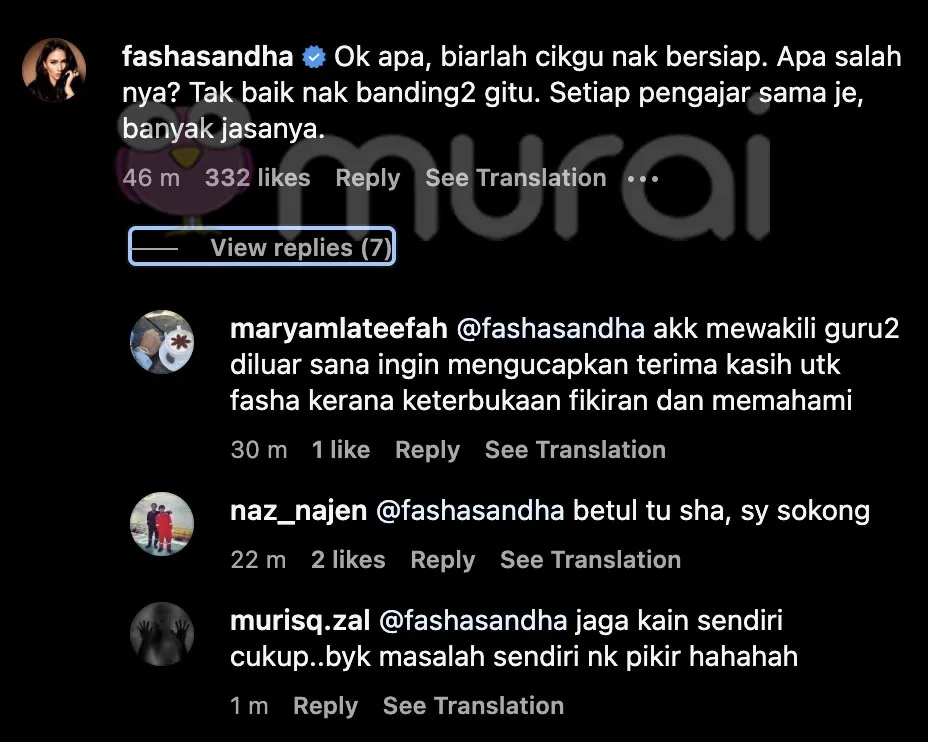 Komen Fasha mendapat persetujuan dari netizen termasuklah dari golongan guru-guru.