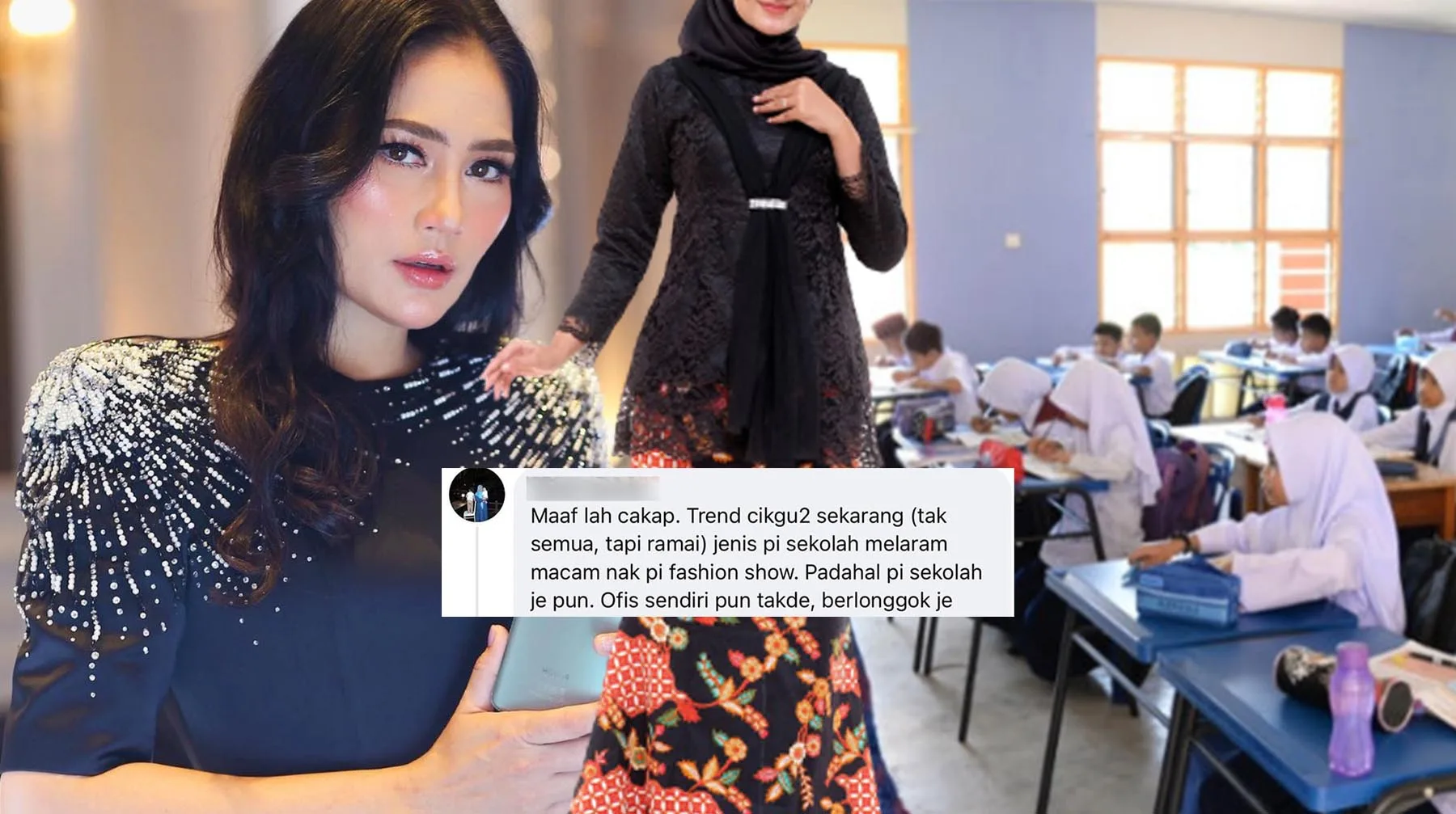 “Trend cikgu-cikgu sekarang (tak semua, tapi ramai) jenis pergi ke sekolah melaram macam nak pergi pertunjukkan fesyen. Padahal pergi sekolah je pun. Pejabat sendiri pun tiada, berlonggok jer. Semua duduk dalam bilik guru tanpa penghawa dingin, tapi perasan macam nak pergi ‘catwalk'”- tulisnya