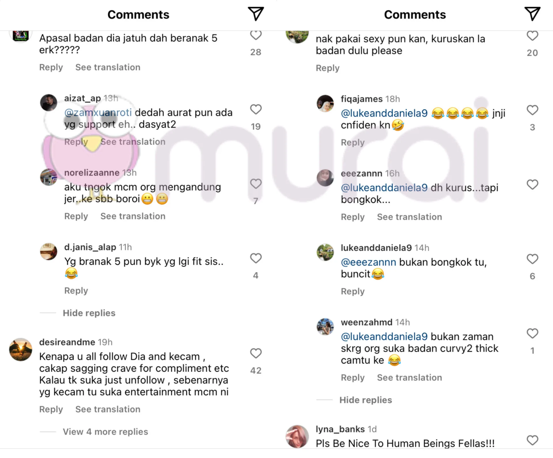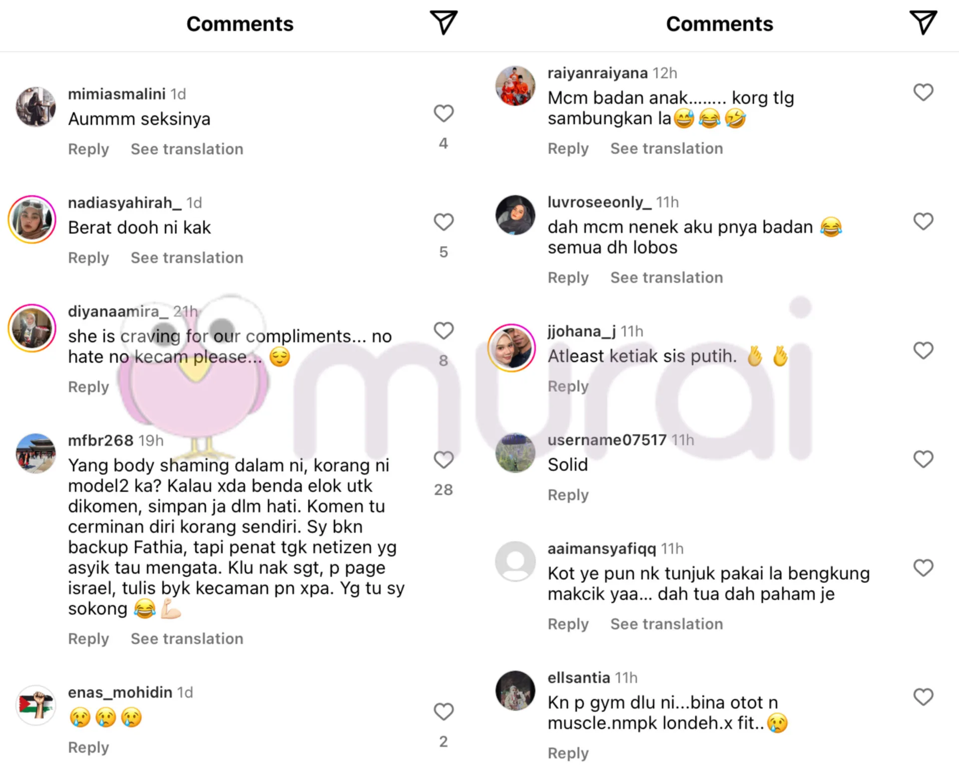 Menjengah ke ruangan komen, rata-rata netizen dilihat mengkritik saiz tubuh badan penyanyi, malah ramai yang menitipkan nasihat agar Fathia bersenam di gimnasium.