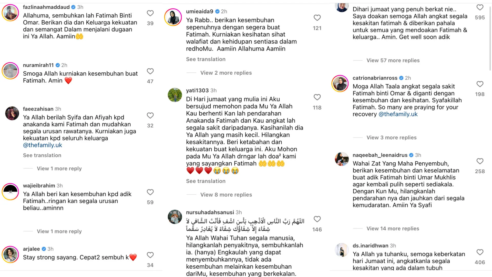 “Moga Allah Taala angkat segala sakit Fatimah binti Omar & diganti dengan kesembuhan dan kesihatan. Syafakillah Fatimah. So many are praying for your recovery.”-Catriona Ross