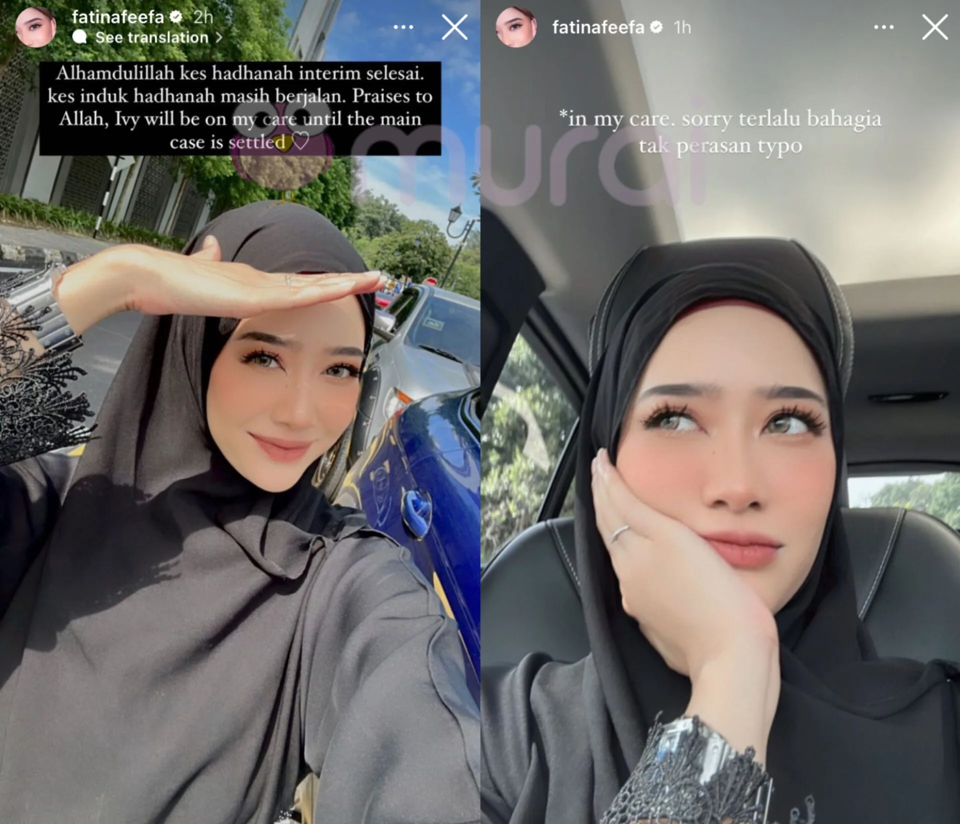 “Alhamdulillah kes hadhanah interim selesai. Kes induk hadhanah masih berjalan. Praises Allah, Ivy akan berada di bawah jagaan saya sehingga kes utama selesai.”-kongsi Fatin Afeefa di Insta Stories