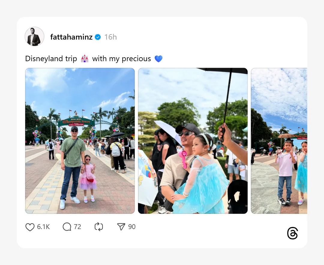 Menerusi hantaran di media sosial Instagram dan Thread, Fattah turut memuatnaik beberapa foto yang memaparkan Fatima yang kelihatan comel memakai gaun salah satu watak animasi popular Frozen, Elsa yang berwarna biru ketika bersiar-siar sekitar Hong Kong Disneylang bersama sepupunya yang lain.