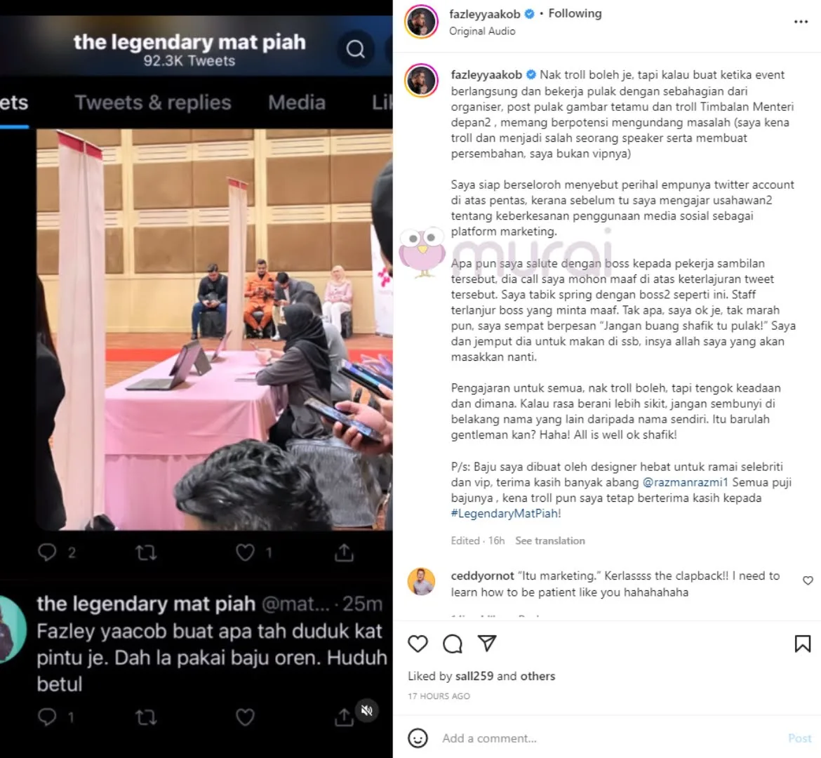 “Nak troll,boleh je, tapi kalau buat ketika event berlangsung dan bekerja pulak dengan sebahagian dari organiser, post pulak gambar tetamu dan troll Timbalan Menteri depan-depan, memang berpotensi mengundang masalah. (Saya kena troll dan menjadi salah seorang speaker serta membuat persembahan, saya bukan vipnya).”-Tulis Fazley