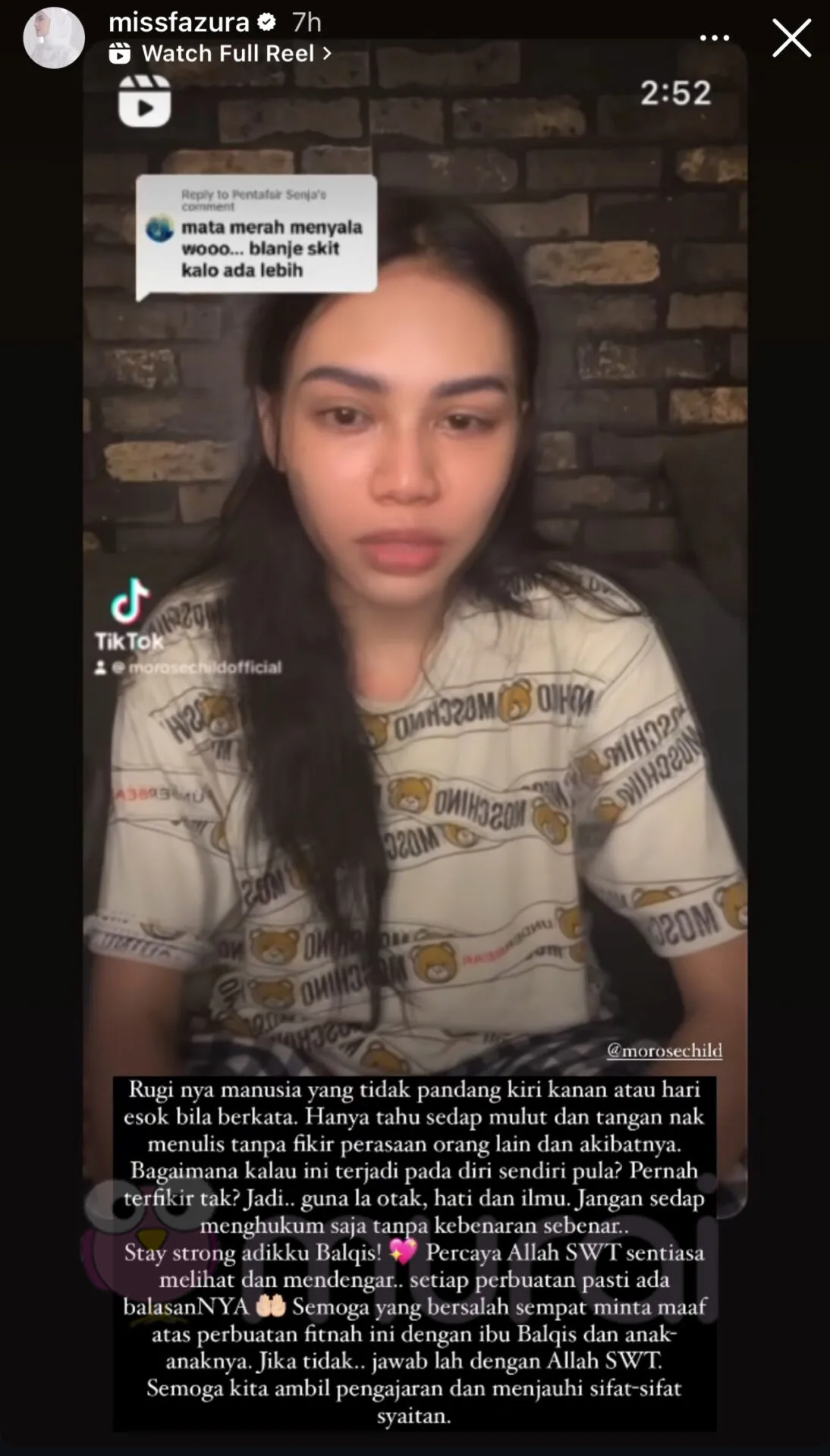 Jangan sedap menghukum saja tanpa kebenaran sebenar. Semoga yang bersalah sempat minta maaf atas perbuatan fitnah ini dengan ibu Balqis dan anak-anaknya. Jika tidak jawablah dengan Allah SWT.”-tulis Fazura di Instagram