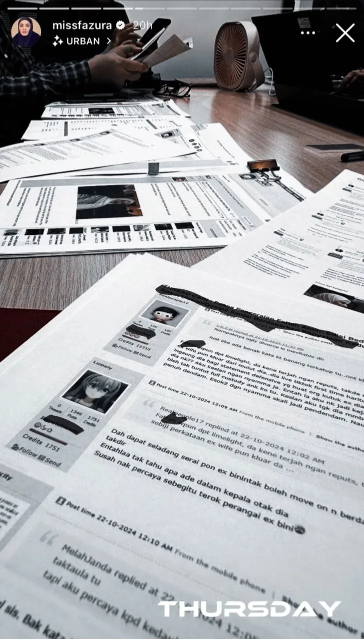 Apa yang lebih menarik perhatian adalah perkongsian foto beberapa salinan komen yang dipercayai dijadikan bukti terhadap netizen yang menyebarkan tohmahan tidak berasas, khususnya selepas Fazura bercerai dengan aktor Fattah Amin. Lebih menyedihkan, ada antara komen yang turut menyentuh tentang arwah bapanya, sekaligus menyentuh sensitiviti dan perasaan pelakon filem Pisau Cukur itu sebagai seorang anak dan ibu.