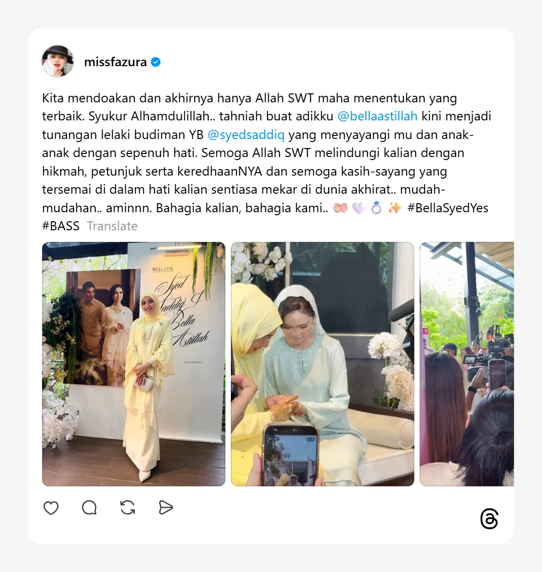 Semoga Allah SWT melindungi kalian dengan hikmah, petunjuk serta keredhaanNYA dan semoga kasih-sayang yang tersemai di dalam hati kalian sentiasa mekar di dunia akhirat.. mudah-mudahan.. aminnn. Bahagia kalian, bahagia kami.. 🤲🏻🤍💍✨.”-tulis Fazura di Threads