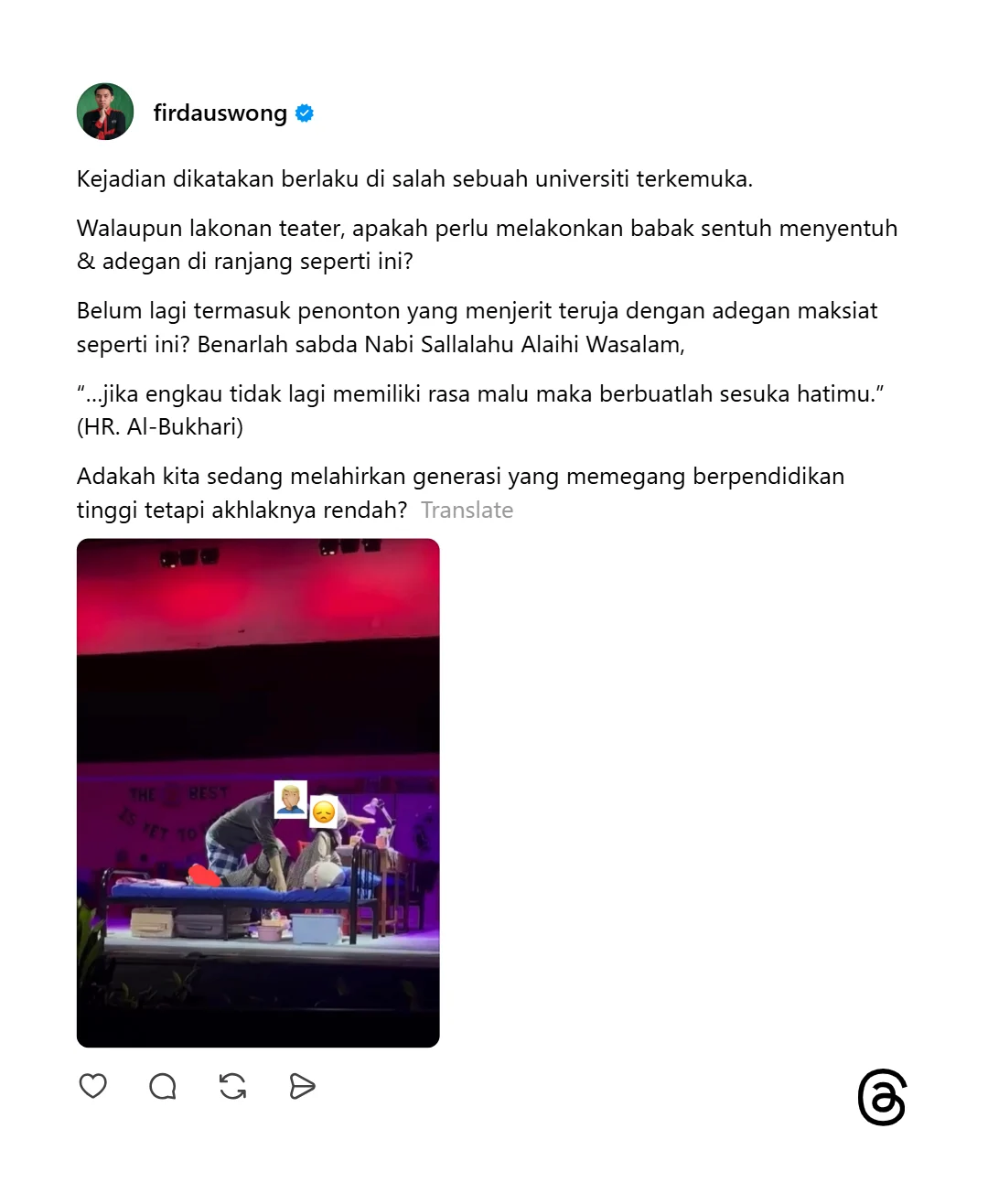Firdaus Wong menerusi hantaran di Thread, turut mempersoalkan tindakan pihak terlibat yang melakonkan babak bersentuhan dan adegan ranjang sedemikian walapun ia hanya lakonan teater.
