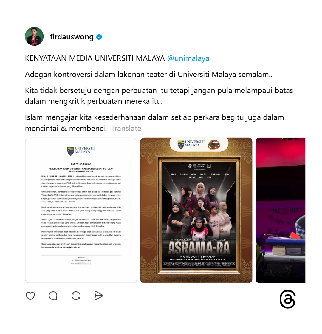 “Adegan kontroversi dalam lakonan teater di Universiti Malaya semalam.. Kita tidak bersetuju dengan perbuatan itu tetapi jangan pula melampaui batas dalam mengkritik perbuatan mereka itu.Islam mengajar kita kesederhanaan dalam setiap perkara begitu juga dalam mencintai & membenci.”-tambah Firdaus Wong lagi