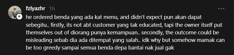 “Kalau benda tu ada dalam menu, pelanggan memang akan order. Jadi tak salah pun kalau dia expect dapat makanan yang sepatutnya,”