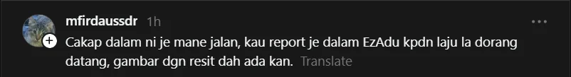 Menurut mereka, pengguna boleh membuat laporan melalui platform aduan pengguna seperti aplikasi EzAdu sekiranya mempunyai bukti seperti resit pembelian dan gambar makanan.