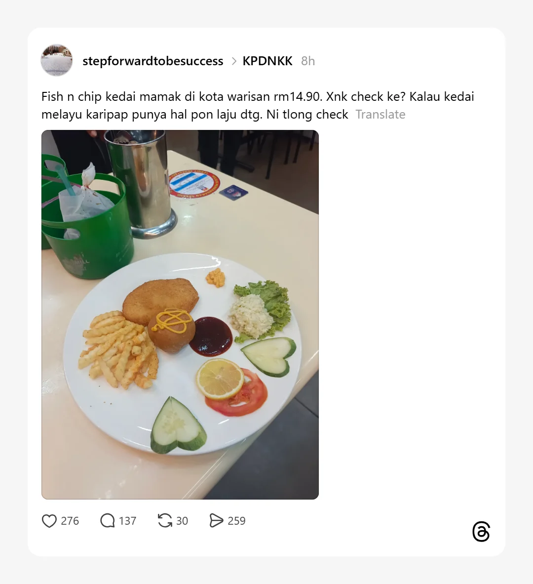 Menerusi hantaran yang dimuat naik di Thread, individu tersebut mempersoalkan sama ada pihak berkuasa perlu menyemak perkara itu selepas mendakwa hidangan yang diterima tidak setimpal dengan harga RM14.90 yang dikenakan.