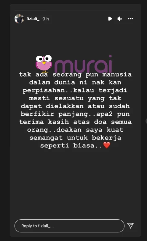 Dalam hantaran susulan di Insta-story miliknya, Fizi turut menyifatkan perpisahan mereka sebagai sebuah langkah yang tidak dapat dielak mahupun telah lama difikirkan sebelum ini.