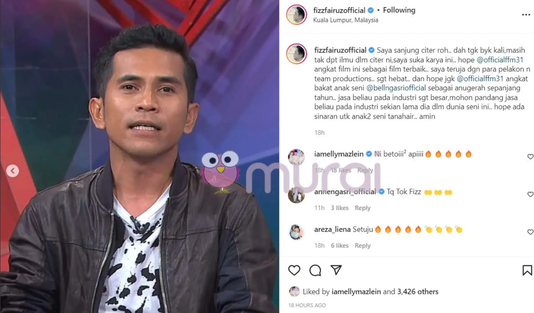 “Hope jugak @officialffm31 angkat bakat anak seni @bellngasri sebagai anugerah sepanjang tahun.. Jasa beliau pada industri sangat besar. Mohon pandang jasa beliau pada industri sekian lama dia dalam dunia seni ini. Hope ada sinaran untuk anak-anak seni tanahair..Aminn”-Fizz Fairuz