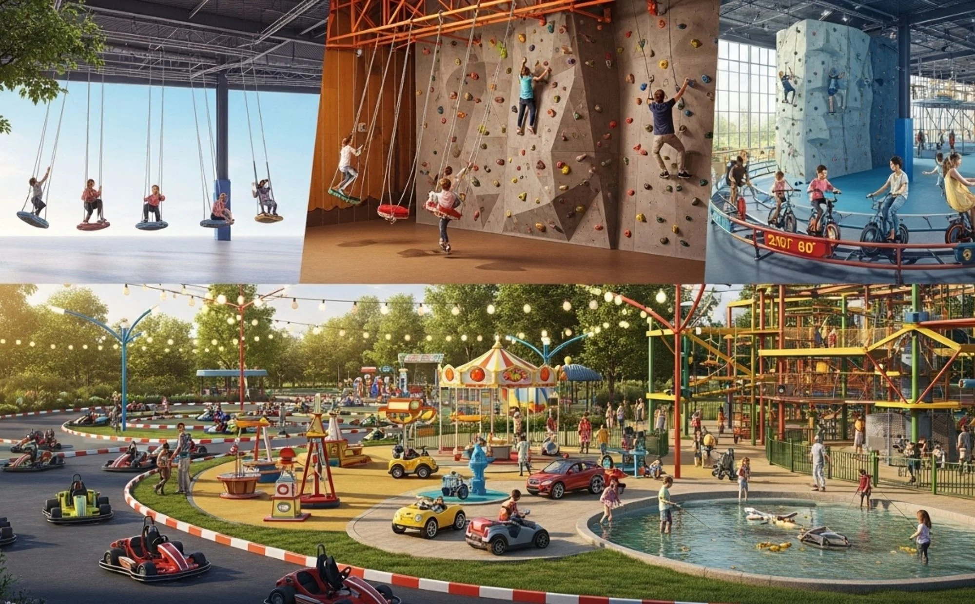 Bahagian indoor menempatkan pelbagai permainan arked dan aktiviti fizikal yang sesuai untuk kanak-kanak serta remaja. Antara permainan yang boleh dicuba termasuk buaian gergasi, wall climbing, basikal 360 darjah serta pelbagai permainan panjat dan cabaran fizikal ringan. Turut disediakan permainan video, lumba kereta dan permainan sukan mini yang sesuai untuk seisi keluarga.