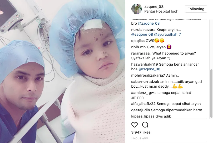 Harini, anak kepada pelakon Ayu Raudhah, Aisy Aryan dikhabarkan telah dimasukkan ke Pantai Hospital Ipoh dan kini sedang menjalani pembedahan.