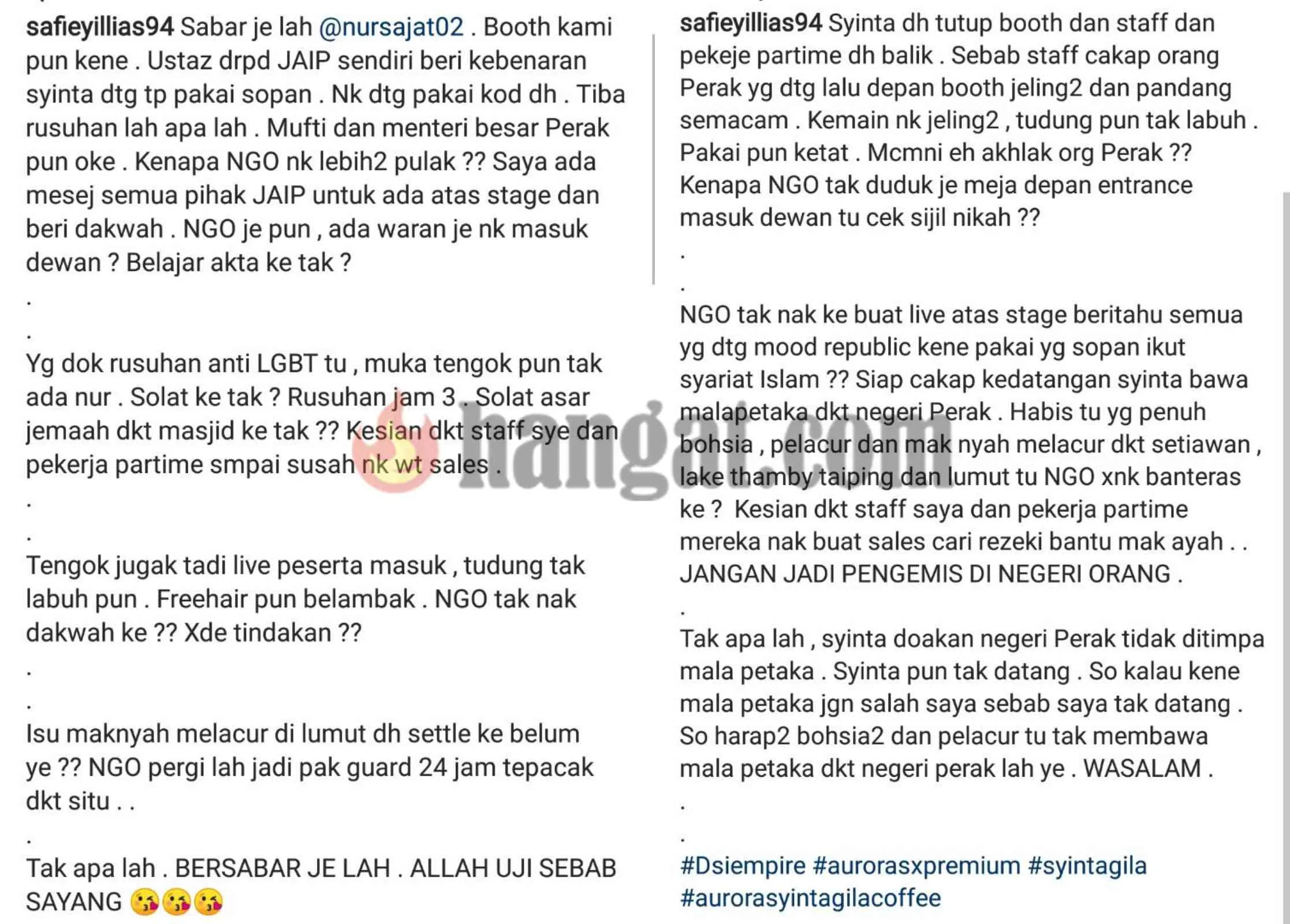 Turut mengalami nasib yang sama adalah gerai milik Safiey. Menerusi Instagram nya, Safiey mendakwa pekerja nya juga seperti dimalukan sehingga memaksa mereka menutup gerai di acara itu.
