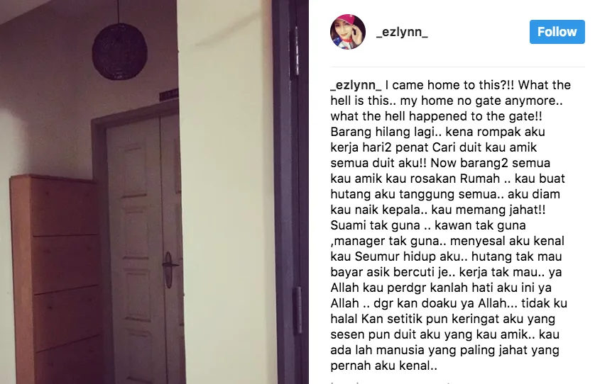 Penyanyi dan pelakon Ezlynn menerima nasib malang apabila rumahnya dimasuki perompak yang disyaki angkara suaminya sendiri. Ezlynn telah menceritakan kejadian ini menerusi laman media sosial dan rata-rata netizen menasihatinya supaya melaporkan pada pihak polis.
