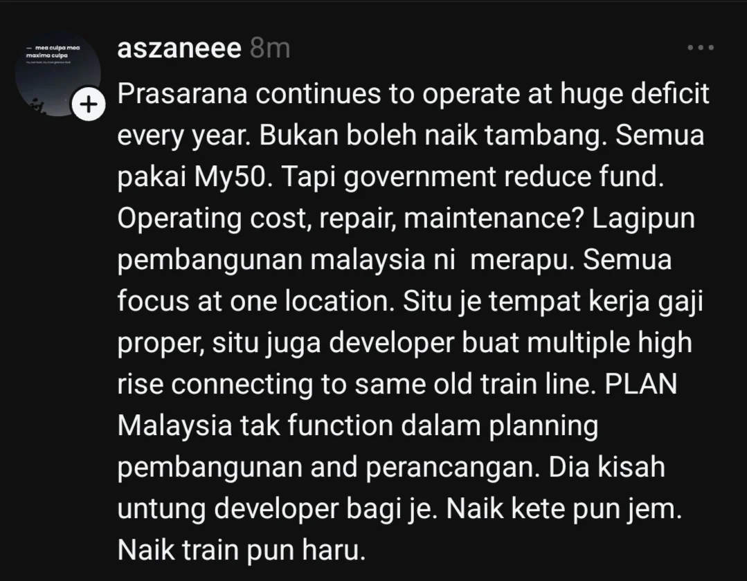 Sebahagian netizen turut menyentuh isu perancangan bandar yang dilihat tidak seimbang, apabila pembangunan pesat tertumpu di kawasan tertentu tanpa penambahbaikan kapasiti pengangkutan yang seiring.