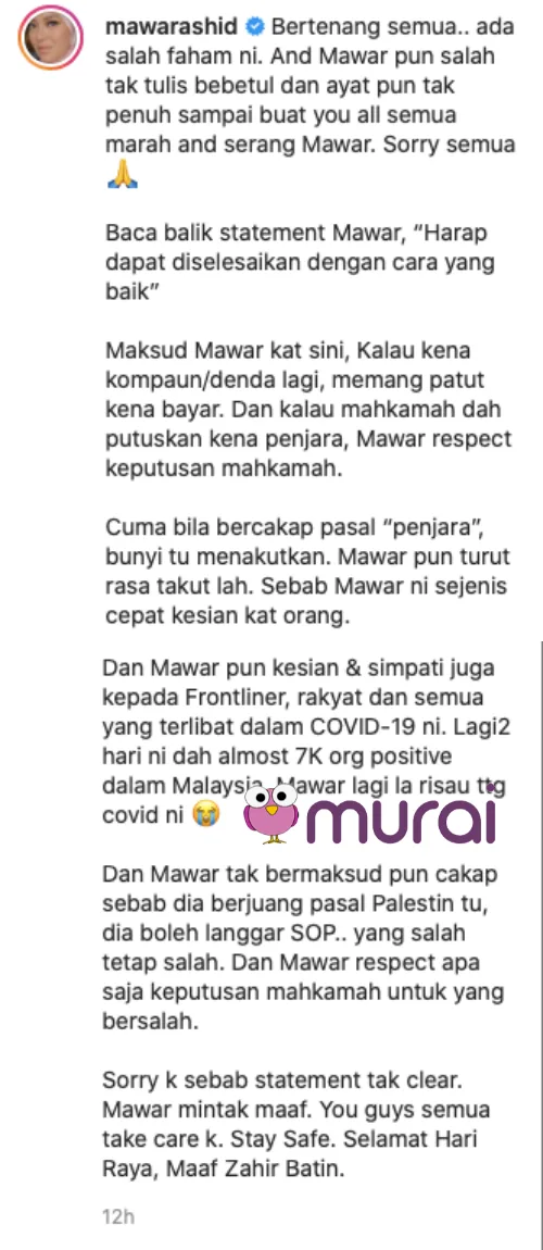 “Bertenang semua.. ada salah faham ni. And Mawar pun salah tak tulis bebetul dan ayat pun tak penuh sampai buat you all semua marah and serang Mawar. Sorry semua” tulisnya