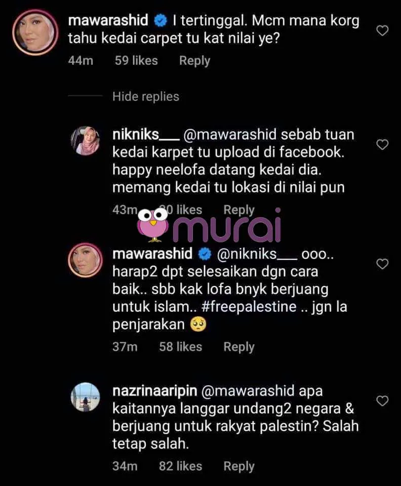 Selepas dijelaskan oleh seorang netizen, Mawar turut berharap agar ia dapat diselesaikan dengan baik selain berasa kasihan sekiranya Neelofa dipenjarakan berikutan dia banyak menyatakan sokongan dan berjuang terhadap pembebasan Palestin.