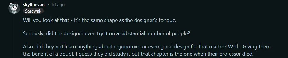 Sebahagian pengguna turut mempersoalkan sama ada rekaan tersebut benar-benar diuji dari segi keselesaan penggunaan, atau sekadar dihasilkan bagi memenuhi keperluan minimum tanpa mengambil kira pengalaman pengguna.
