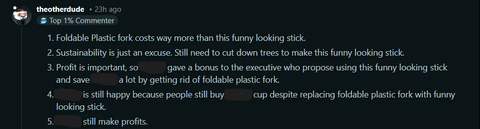 Perbandingan turut dibuat dengan jenama lain yang masih mengekalkan penggunaan garfu plastik, yang dianggap lebih praktikal oleh pengguna walaupun kosnya lebih tinggi.
