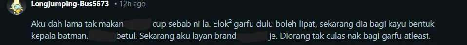 Menurut pengadu, rekaan tersebut menyukarkan proses menyuap mi, berbanding dengan garfu plastik lipat yang pernah digunakan sebelum ini. Situasi itu menyebabkan sesetengah pengguna terpaksa mendapatkan sudu atau garfu plastik lain, termasuk daripada kedai serbaneka, semata-mata untuk menikmati hidangan mereka dengan selesa.