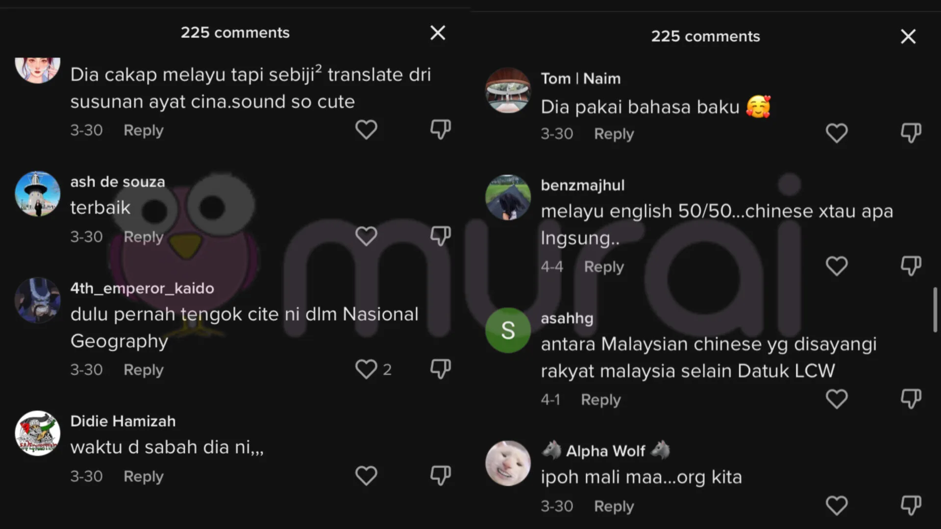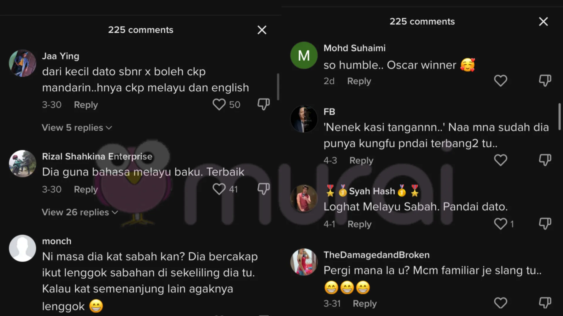 Tinjauan Murai MY di ruangan komen, rata-rata netizen dilihat meluahkan rasa teruja melihat Michelle Yeoh bertutur dalam bahasa Melayu, malah ada yang menyifatkan pemenang anugerah Oscars ini antara Melayu-Cina yang disayangi rakyat Malaysia selain lagenda badminton negara, Datuk Lee Chong Wei.
