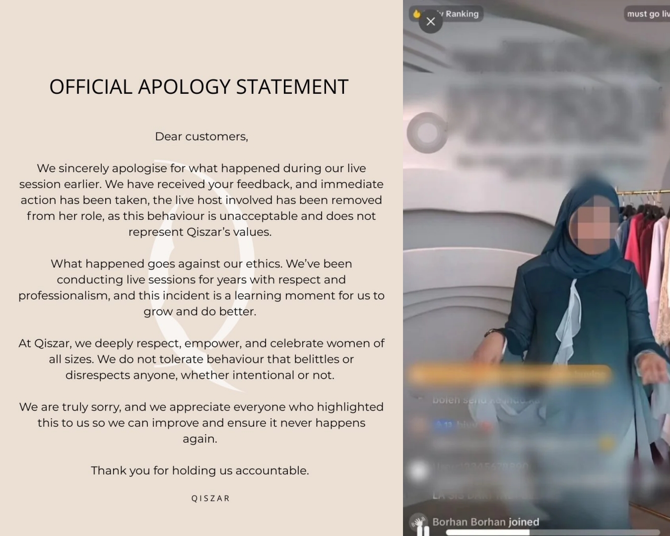 Baru-baru ini, seorang wanita yang bekerja sebagai hos siaran langsung (live host) bagi jenama fesyen Qiszar telah mendapat kecaman dan kritikan daripada orang ramai.
