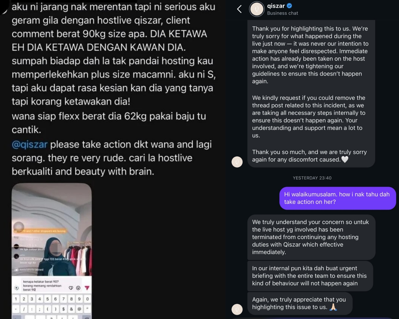 Pengguna Threads tersebut juga menggesa pihak Qiszar untuk mengambil tindakan terhadap live host yang telah menyindir berat padan pelanggannya.