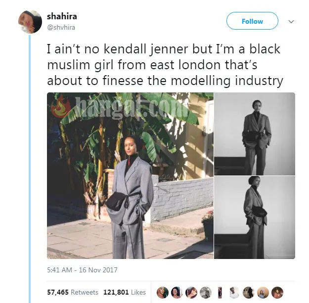 “Saya bukanlah Kendall Jener, melainkan seorang wanita muslim berkulit hitam dari London Timur yang memiliki bakat dalam industri modeling,” tulis Shahira pada akaun Twitternya. Tweet tersebut telah mendapatkan 57,000 lebih retweet dan ratusan komen.