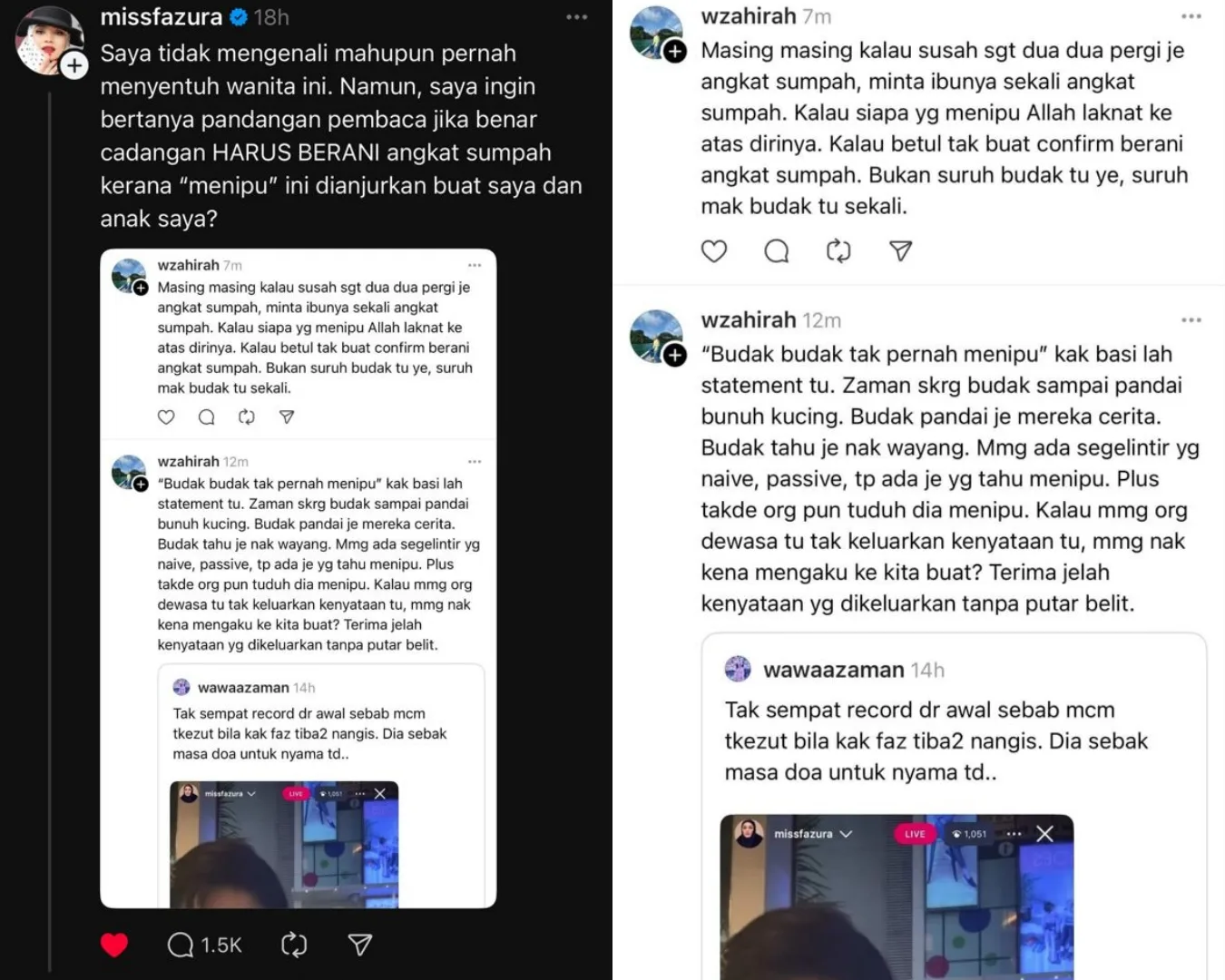 Terdahulu, Fazura ada membuat hantaran tangkapan skrin di platform Threads apabila seorang individu meminta dua beranak itu untuk mengangkat sumpah kerana percaya bahawa Fatima bercakap bohong mengenai Nenda.