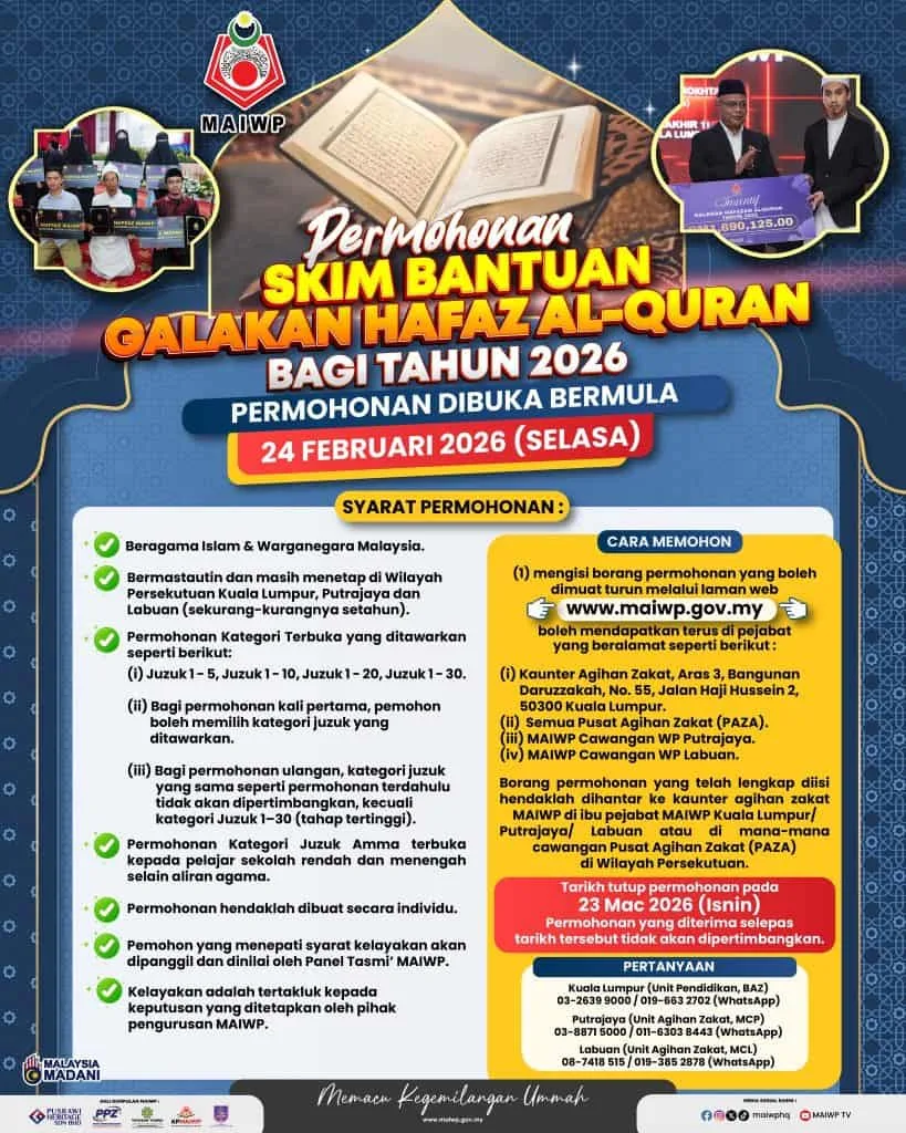 Berita baik buat para huffaz di Wilayah Persekutuan, Majlis Agama Islam Wilayah Persekutuan (MAIWP) membuka permohonan Skim Bantuan Galakan Hafaz Al-Quran bagi tahun 2026. Skim ini diwujudkan khusus untuk memberi galakan dan penghargaan kepada penghafaz al-Quran di Kuala Lumpur, Putrajaya dan Labuan selain ingin terus memartabatkan serta menjaga kesucian kitab suci Al-Quran. Bagi yang layak dan lulus penilaian, insentif kewangan akan diberikan mengikut kategori hafazan yang dipohon.