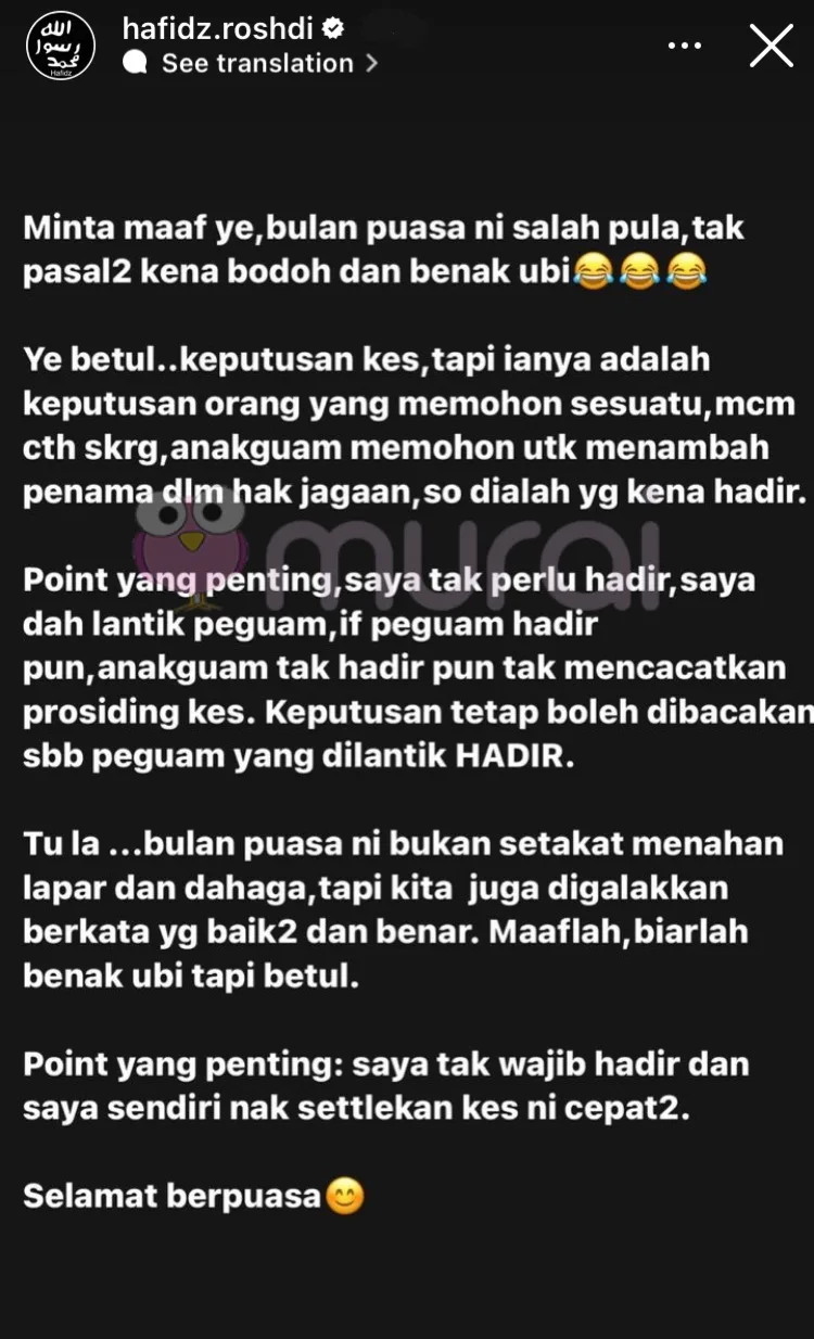 Point yang penting, saya tak perlu hadir, saya dah lantik peguam, jika peguam hadir pun, anak guam tak hadir pun tetap tak mencacatkan prosiding kes. Keputusan tetap boleh dibacakan sebab peguam yang dilantik hadir.”-jelas Hafidz di Instagram