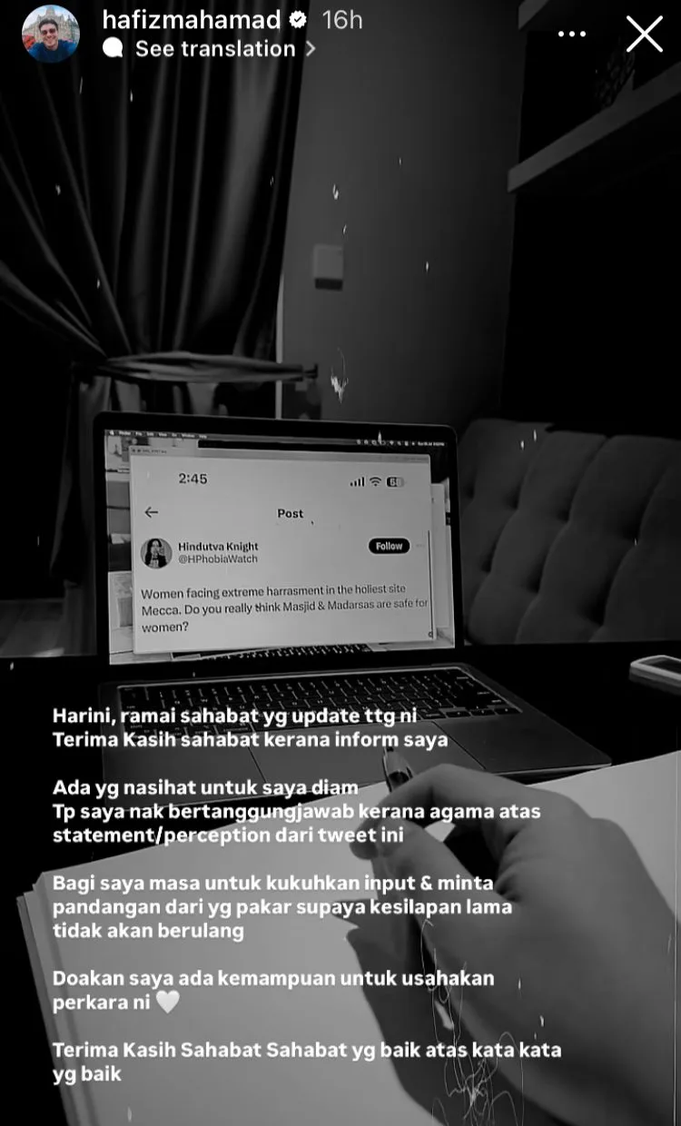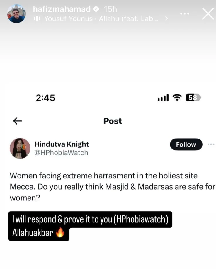 Terkini, salah seorang warganet di laman X yang dikenali sebagai @Hindutva Knight melakukan hantaran mengenai Hafiz, yang berpendapat wanita mengalami gangguan ekstrim ketika melakukan ibadah di Mekah.