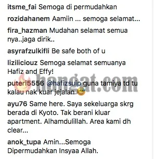 Melihatkan pada keadaan taufan disana yang agak membimbangkan, rata-rata pengikutnya turut mendoakan semoga Hafiz dan isteri selamat dan dipermudahkan urusan dalam menempuh bencana alam tersebut.