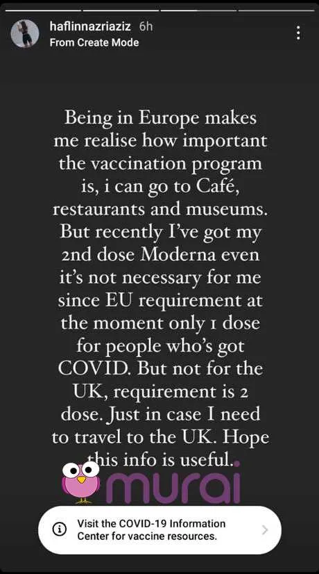 “Berada di Eropah membuatkan saya sedar akan kepentingan program vaksin, saya boleh ke kafe, restoran dan muzium. Tetapi, baru-baru ini saya mendapat suntikan Moderna yang kedua walaupun saya tidak memerlukannya kerana negara Eropah hanya mensyaratkan satu dos suntikan vaksin COVID-19. Tetapi tidak bagi United Kingdom(UK), kerana mereka mensyaratkan wajib mengambil dua dos suntikan. Sebagai persiapan awal sekiranya saya perlu ke UK. Harap info ini akan berguna” – tulis Haflin